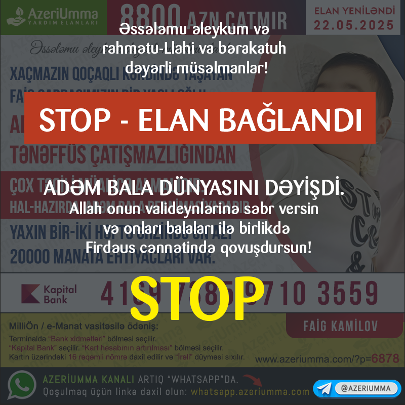 🤲 Allah onun valideynlərinə səbr versin və onları balaları ilə birlikdə Firdəus cənnətində qovuşdursun!
