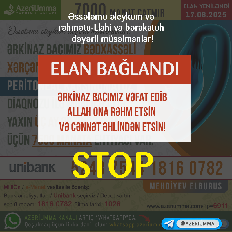 🤲 Ərkinaz bacımız vəfat edib. Allah ona rəhm etsin və cənnət əhlindən etsin! Əmin!