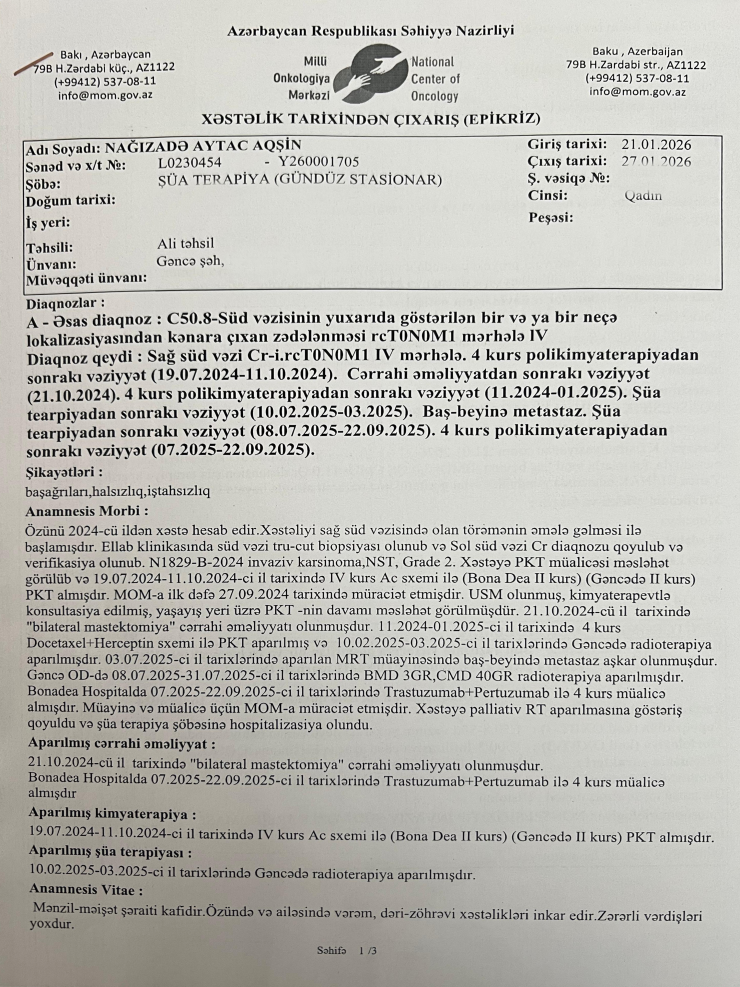 Gəncədə yaşayan 26 yaşlı Aytac bacımız iki ildir xərçəng xəstəliyindən müalicə alır.