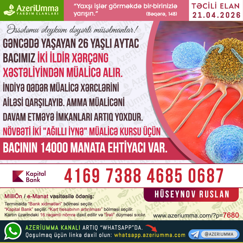 İndiyə qədər müalicə xərclərini ailəsi qarşılayıb. Amma müalicəni davam etməyə imkanları artıq yoxdur.