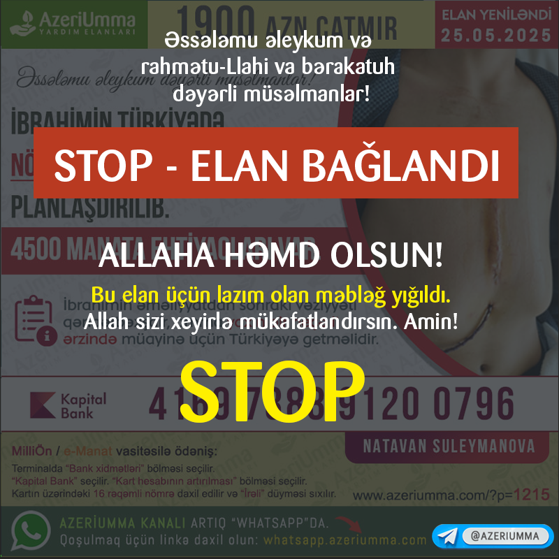⚠️ Allaha həmd olsun! Bu elan üçün lazım olan məbləğ yığıldı.