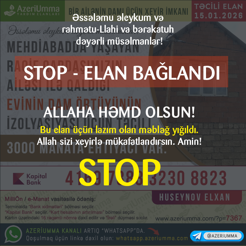 ⚠️ Allaha həmd olsun! Bu elan üçün lazım olan məbləğ yığıldı.