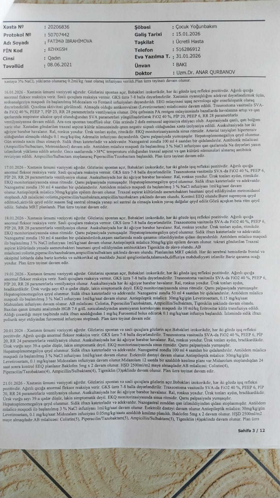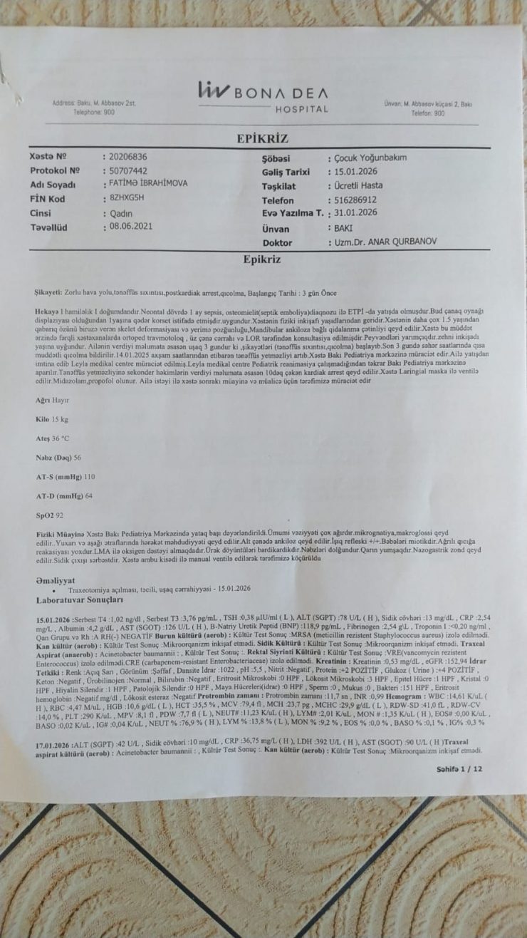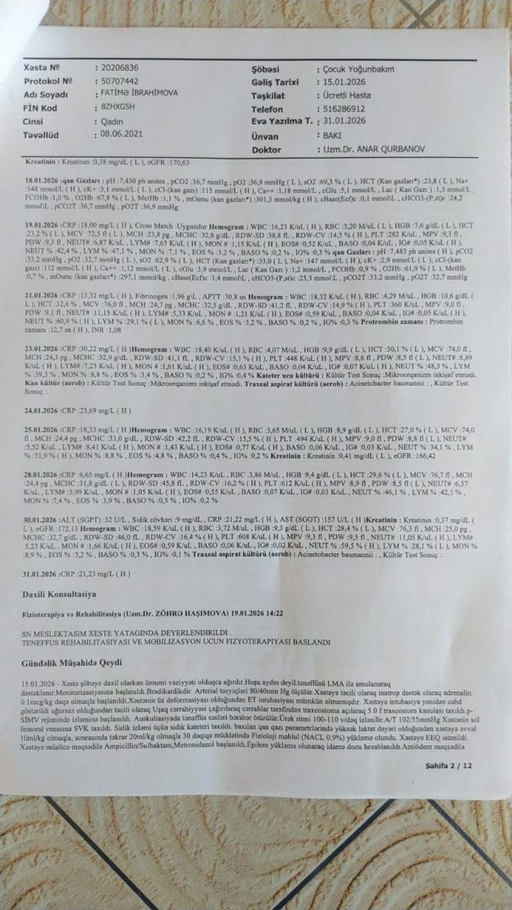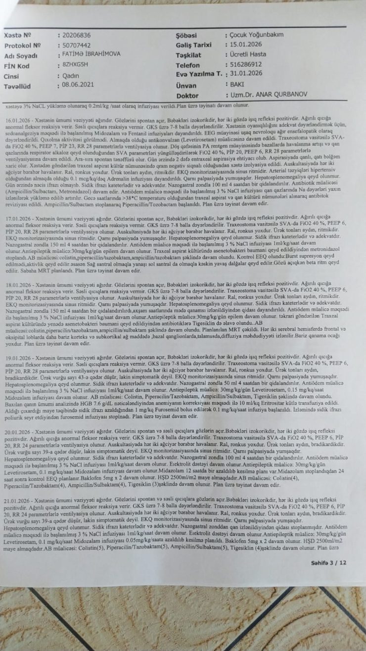 Mehman qardaşımızın azyaşlı qızı Fatimənin vəziyyəti yanvar ayında qəfil ağırlaşmış və o, Qarayev adına Uşaq Xəstəxanası-nın reanimasiya şöbəsində kliniki ölüm keçirmişdir. Daha sonra təcili olaraq Bona Dea Hospital-a köçürülərək müalicə almış və müəyyən stabilləşmədən sonra evə buraxılmışdır.