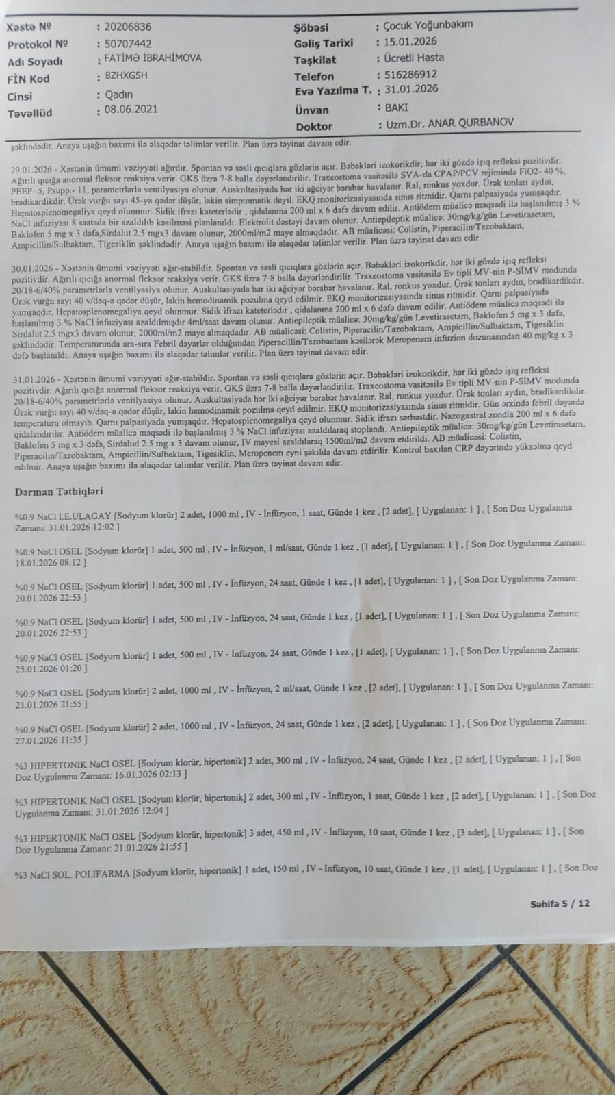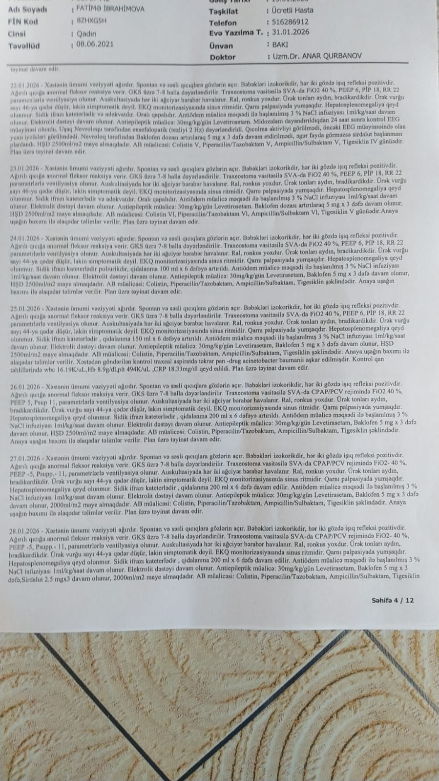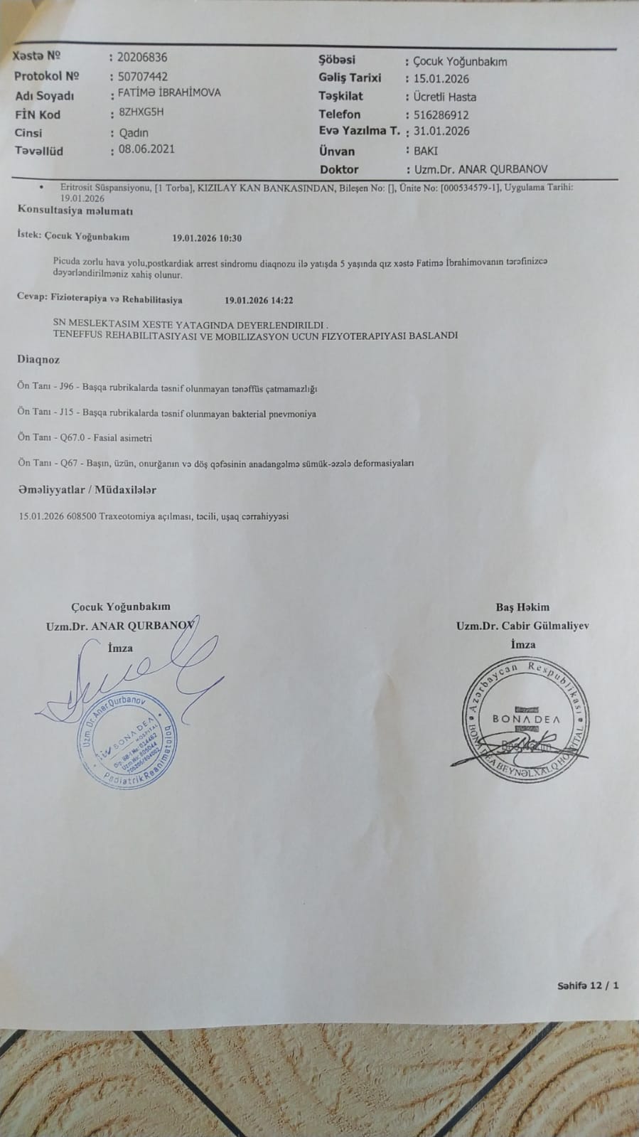 Mehman qardaşımızın azyaşlı qızı Fatimənin vəziyyəti yanvar ayında qəfil ağırlaşmış və o, Qarayev adına Uşaq Xəstəxanası-nın reanimasiya şöbəsində kliniki ölüm keçirmişdir. Daha sonra təcili olaraq Bona Dea Hospital-a köçürülərək müalicə almış və müəyyən stabilləşmədən sonra evə buraxılmışdır.