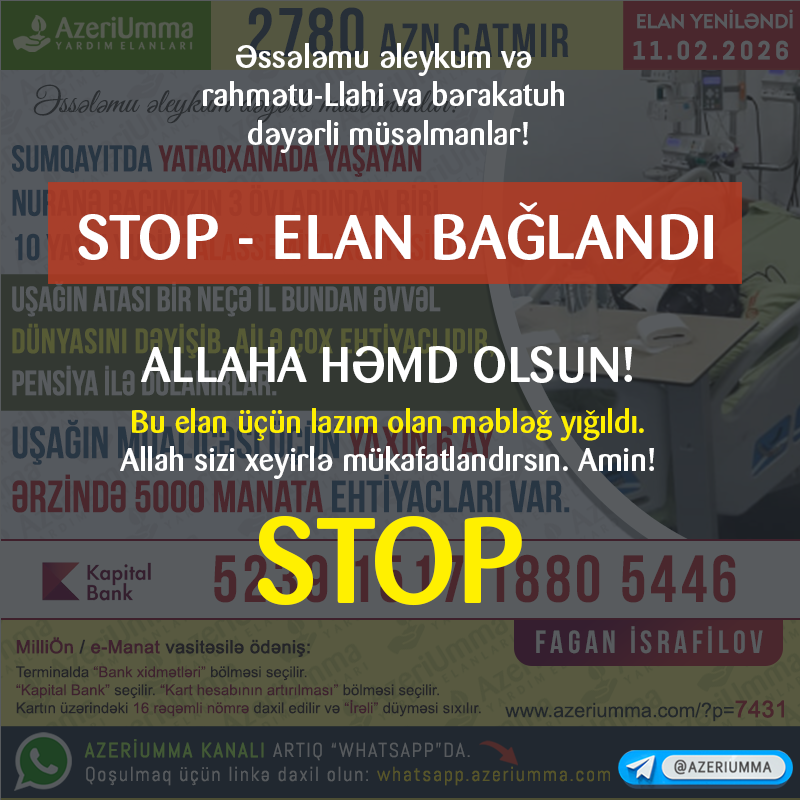 ⚠️ Allaha həmd olsun! Bu elan üçün lazım olan məbləğ yığıldı.