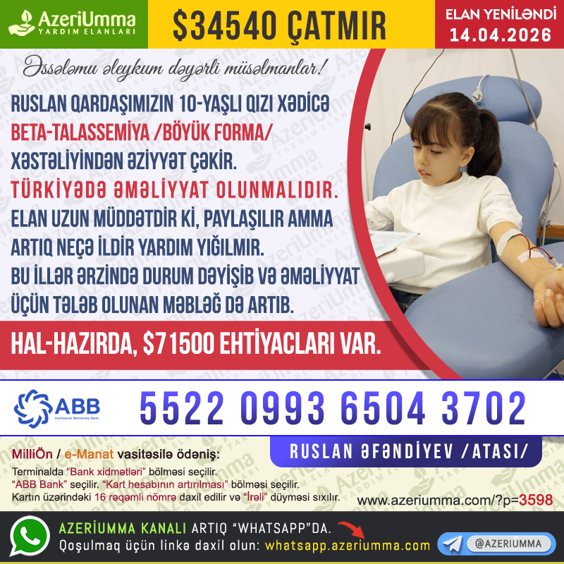 Ruslan qardaşımızın 10-yaşlı qızı Xədicə beta-talassemiya (böyük forma) xəstəliyindən əziyyət çəkir.