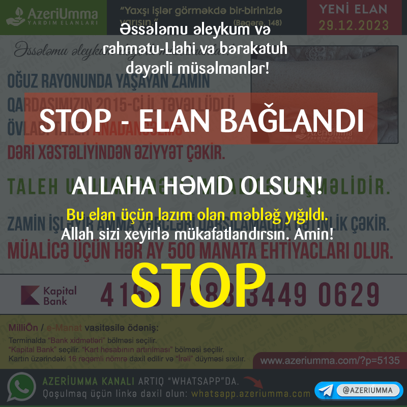 Oğuz rayonunda yaşayan Zamin qardaşımızın 2015-ci il təvəllüdlü övladı Taleh anadangəlmə dəri xəstəliyindən əziyyət çəkir. Taleh uzunmüddətli müalicə keçməlidir. Zamin işləyir amma xərcləri qarşılamaqda çətinlik çəkir. Müalicə üçün hər ay 500 manata ehtiyacları olur.