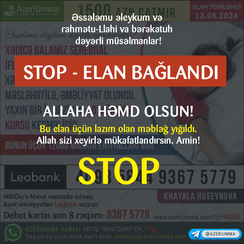 ⚠️ Allaha həmd olsun! Bu elan üçün lazım olan məbləğ yığıldı.