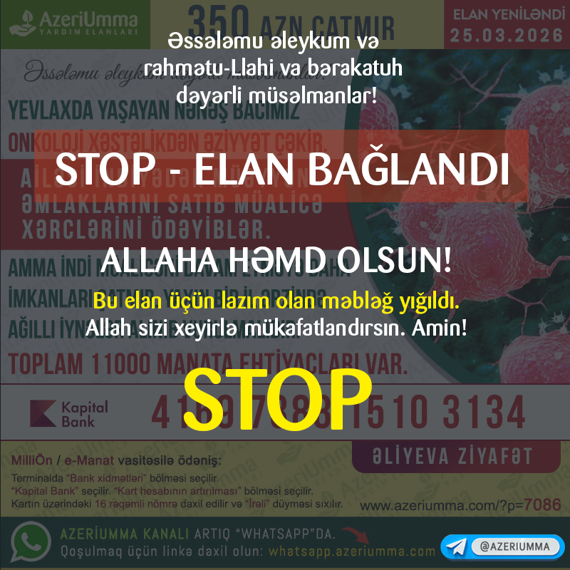 ⚠️ Allaha həmd olsun! Bu elan üçün lazım olan məbləğ yığıldı.