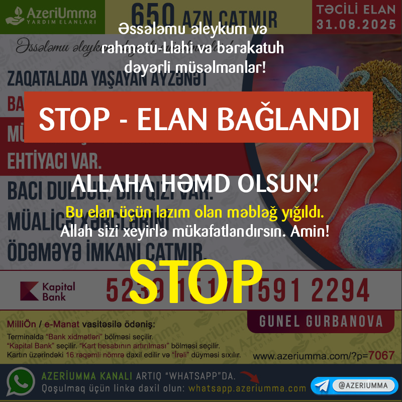 ⚠️ Allaha həmd olsun! Bu elan üçün lazım olan məbləğ yığıldı.